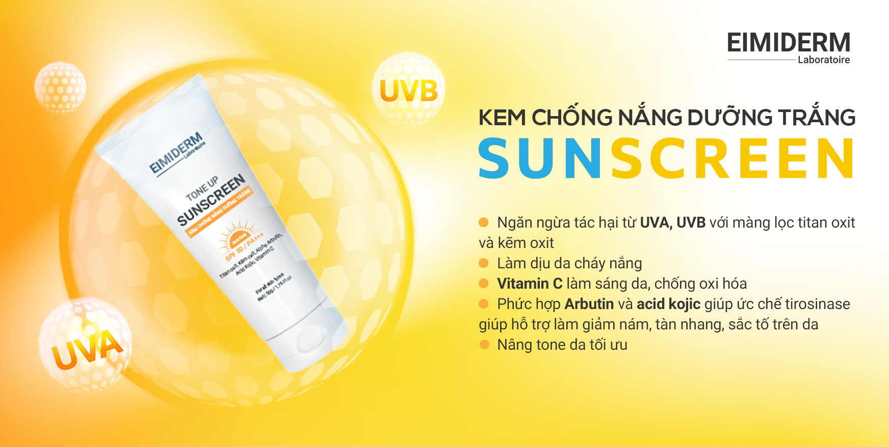 Kem chống nắng EIMIDERM Tone Up Sunscreen không chỉ giúp bảo vệ da khỏi tác hại của tia UV mà còn cung cấp dưỡng chất dưỡng trắng, trẻ hóa da, cho bạn làn da sáng mịn và rạng rỡ mỗi ngày.