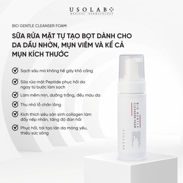 Sữa rửa mặt tự tạo bọt BIO GENTLE CLEANSER FOAM là sản phẩm đến từ thương hiệu mỹ phẩm Usolab. Sản phẩm được thiết kế để phù hợp với mọi loại da, với sự kết hợp của 31 loại peptide cùng công nghệ độc quyền của nhà Usolab giúp làm sạch và giữ ẩm cho làn da mà không ảnh hưởng đến hàng rào bảo vệ da mặt và cơ thể. Duy trì làn da khỏe mạnh, mịn màng và không gây khô da.