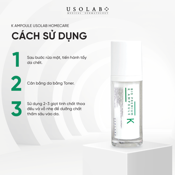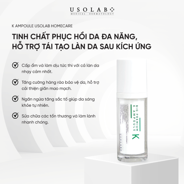 Tinh chất Usolab Bio Premium K Ampoule là giải pháp phục hồi đa công dụng, giúp làm dịu da, giảm đỏ và hỗ trợ phục hồi sau các liệu trình xâm lấn hoặc kích ứng da. Với công thức giàu Vitamin K và các thành phần lành tính, sản phẩm thấm nhanh vào da, mang lại hiệu quả làm dịu tức thì mà không gây nhờn rít. K Ampoule phù hợp với mọi loại da, kể cả da nhạy cảm, giúp làn da trở nên khỏe mạnh, đều màu và mịn màng hơn sau mỗi lần sử dụng.